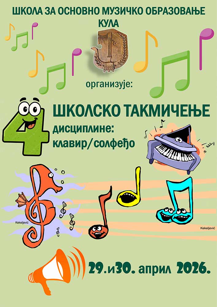 Школа за основно музичко образовање Кула организује ШКОЛСКО ТАКМИЧЕЊЕ дисциплине: клавир/солфеђо. Такмичење ће се одржати 29. и 30. априла 2026. године.