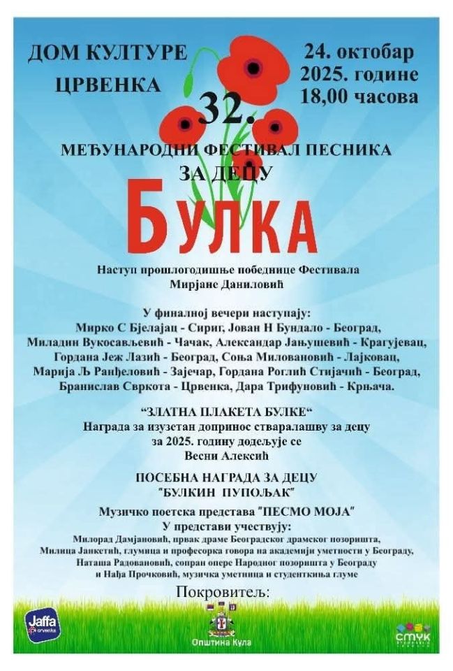 27. октобар 2025.У петак, 24. октобра 2025. године у Дому културе у Црвенки одржан је 32. Међународни фестивал песника за децу Булка. Групну посету ученика ИО у Црвенки у оквиру ваннаставних школских активности на предмету Солфеђо организовале су наставнице Валентина Сукола и Милица Алексић, а придружила им се и директор школе Верица Ожеговић. Ученици су имали прилику да уживају у говорењу песама овогодишњих финалиста, као и да подрже своје вршњаке у писању песама, који су освојили награде у оквиру конкурса за најмлађе песнике.