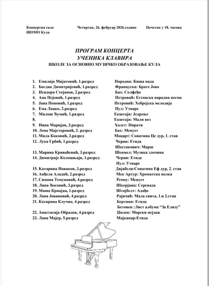 Наставничко веће ШОМО5. фебруар 2026.Стручни скуп „Отворена врата Хармонике“ у МШ „Исидор Бајић“6. март 2026. Концерт ученика клавирског одсека 23. фебруар 2026. Категорије Актуелности Ознаке У четвртак, 26.02.2026. године у 18:00 часова у Концертној сали музичке школе одржаће се концерт ученика клавирског одсека. Улаз слободан. Дели1 Urednik Повезани текстови12. март 2026.Успех тамбураша ШОМО на такмичењу у БечејуОпширније6. март 2026.Стручни скуп „Отворена врата Хармонике“ у МШ „Исидор Бајић“Опширније5. фебруар 2026.Наставничко веће ШОМООпширније