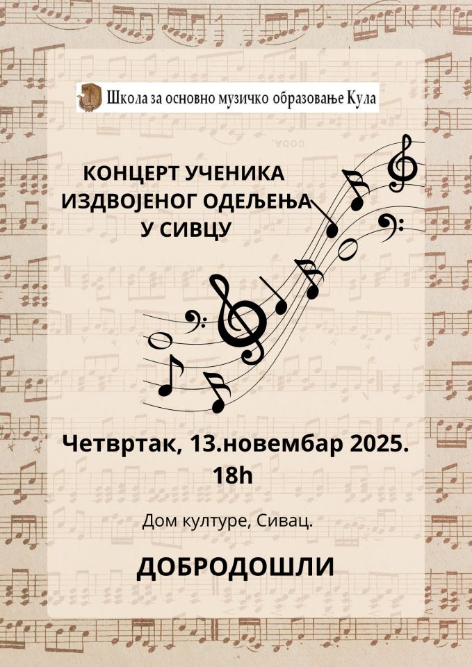 У уторак, 04.11.2025. године у 18:00 и 19:00 часова у ОШ “Вук Караџић“ (мала школа) одржаће се концерти ученика издвојеног одељења у Црвенки. Добродошли!