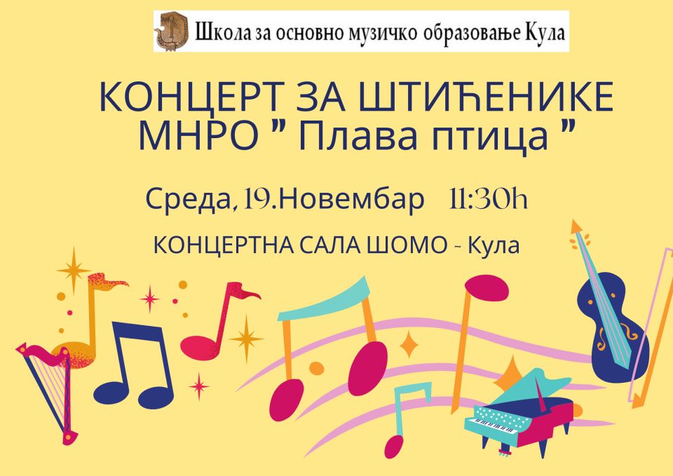 У среду, 19.11.2025. године у 11:30 часова у Концертној сали ШОМО Кула одржаће се концерт за штићенике МНРО “Плава птица“.